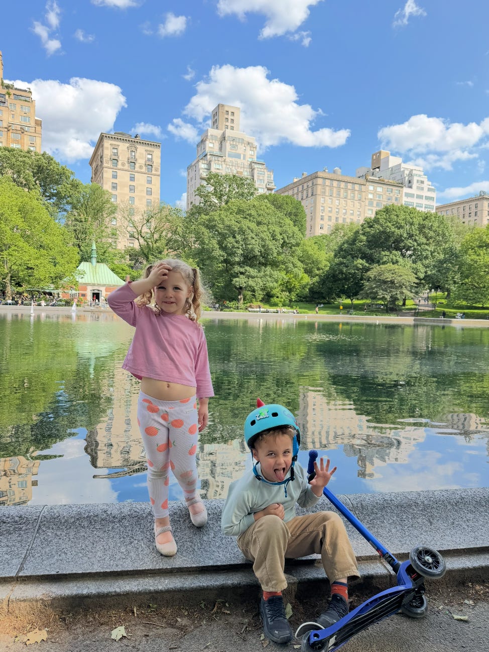 PS. One last thing: I gotta say Central Park looked like a rom-com movie set this week: crisp air, sunny skies, and a gentler breeze, which was ideal for layering looks. Here’s one last pic of my kiddos at the Conservatory Pond.