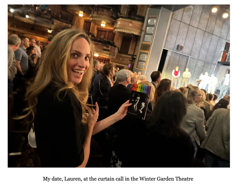My first foray was seeing George Clooney in Good Night and Good Luck. It’s a sleek dramatization of journalist Edward R. Murrow’s televised takedown of Senator Joseph McCarthy during the Red Scare. Clooney oozes charisma, and it was a thrill to see him in person. (On the other end of our aisle, Amal was sitting with U2’s Bono, so that was a thrill, too.) I loved the sets, which were a tribute to TV’s early golden era, and there’s a photo montage at the end that rips the audience into the current state of censorship and fascism. I won’t ruin it here, but the last frame shocked the crowd into silence.