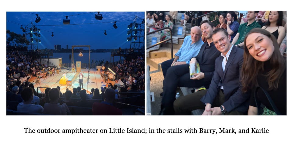 My cultural pursuits ended on Little Island last night. This spectacular pier, designed by Thomas Heatherwick, is a remarkable gift on the West Side of Manhattan. If you haven’t been to it, you must. If you’ve been and you want to know more about it, check out the interview I did for the Wall Street Journal with Barry Diller and Diane von Furstenberg, the visionaries behind most of that part of New York’s cultural resurgences, including the High Line. My favorite quote from Barry: “If you walk up that bridge, leave New York behind and enter our little Oz, and it pleases you, it was all worthwhile. It’s not cancer-curing, but it’s good for the spirit of life.”