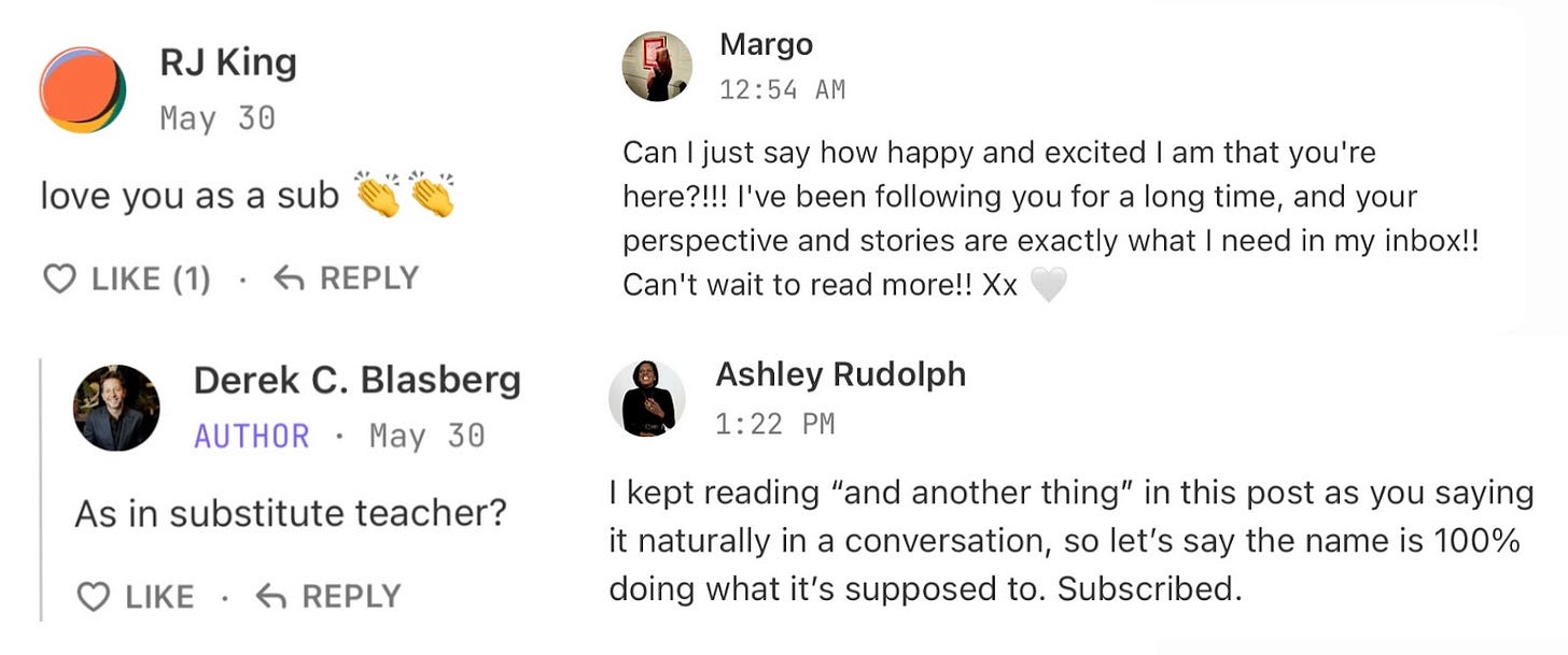 Which brings me back to Substack. I need another app on my phone like I need a hole in my head. AND ANOTHER THING is me dipping my toe into this literary pond with the hopes of finding a place where wordplay is revered, ideas come before trends, thoughtfulness matters more than thirst, and it’s possible—maybe, hopefully?—to have conversations.
