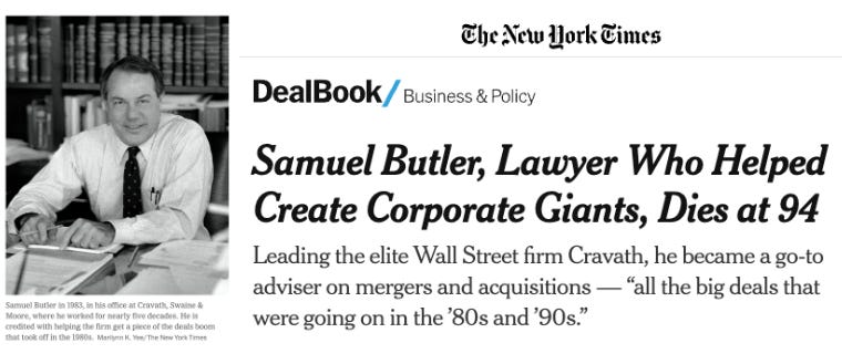 Buffett’s office also noted that when Sam started at Cravath, the average closing price of the DJIA (Dow Jones Industrial Average—don’t worry, I had to look that up too) was $963.99. When he stepped down, it was $8,629.91. “Sam was a remarkable friend and a remarkable lawyer,” he told The New York Times.