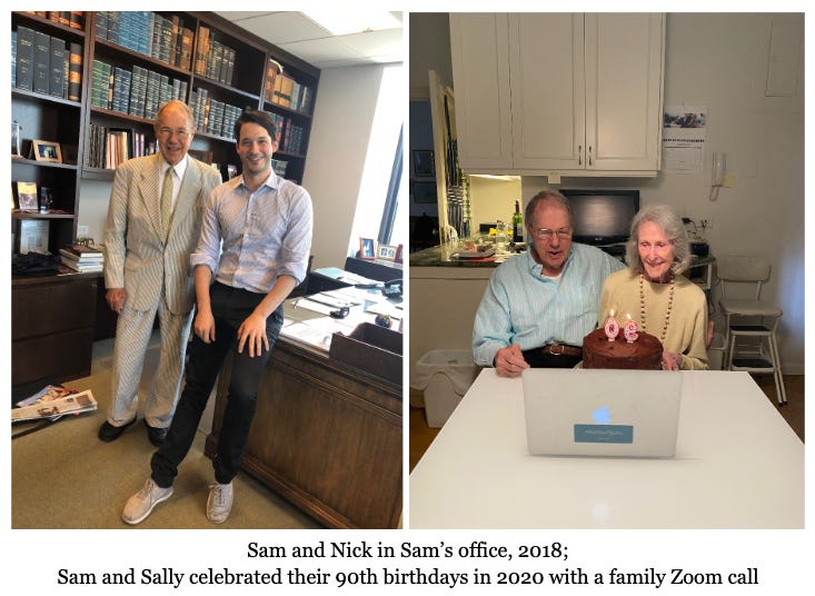 I’ve spent the past week scrolling through photos. There’s one of me trying to impress Sam with a green thumb in his Connecticut garden. (Turns out I’m a better griller than I am a farmer.) There’s one from Sam and Sally’s 90th birthday in 2020, when Nick showed up in a COVID mask with a chocolate cake and set up a family Zoom. There’s one of Sam at Nick’s sister’s wedding, beaming with Sally on his arm. There’s a seriously stylish one we took when we surprised him at the old Cravath offices in summer 2018. We found him in a seersucker suit, naturally, looking like a matinee idol.