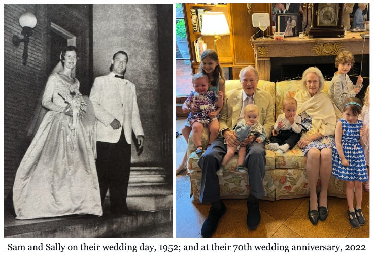 In high school, Sam met Sally Thackston at a friend’s house, fell in love, and wed on June 28, 1952, when they were both 21. They remained happily married for the next 71 years. (Sally, a dignified, elegant woman to the end, passed away at home surrounded by family in October 2023.)