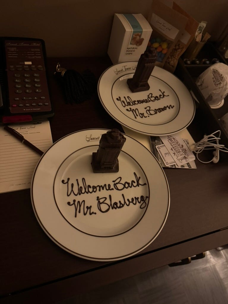 When I checked in, there was a chocolate tower that read, “Welcome to the hotel, Mr. Brown.” I’m friendly with the proprietor, Jeff Klein, so naturally I texted him to complain that it was my partner’s name on the reservation, and not mine. It was also a ruse to get a second tower—and it worked: